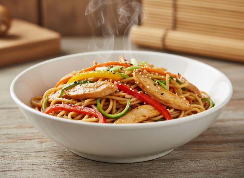 Noodle eriştesi, jülyen tavuk eti, mevsim sebzeleri, hafif soya bazlı sos ile wok ateşinde hazırlanır. Dengeli, doyurucu ve aromatik.